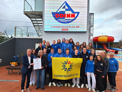 Sundfélagið Óðinn fékk endurnýjun viðurkenningar félagsins sem Fyrirmyndarfélag ÍSÍ við Sundlaug Akureyrar miðvikudaginn 15. október síðastliðinn. Það var Viðar Sigurjónsson sérfræðingur á stjórnsýslusviði ÍSÍ sem afhenti Ástu Birgisdóttur formanni Óðins viðurkenninguna að viðstöddu fjölmenni í blíðviðrinu á Akureyri. Á myndinni eru lengst til vinstri þau Viðar og Ásta með viðurkenninguna á milli sín og lengst til hægri er Ragnheiður Runólfsdóttir yfirþjálfari sundfélagsins og við hlið hennar Helga Björg Ingvadóttir framkvæmdastjóri Íþróttabandalags Akureyrar. Auk þess er á myndinni stór hópur iðkenda innan Fyrirmyndarfélagsins Óðins.